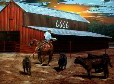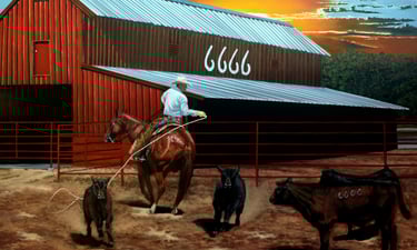 Beman considers himself to be a photo realist and enjoys the challenge of creating “a high-def image on canvas.” While the human eye cannot simultaneously focus on every aspect of a landscape, in a photo realistic painting, everything from the fence post in the foreground to the mountains in the background is crystal clear. Creating such a work requires a trained eye and a whole lot of patience. Beman’s lifelike paintings feature majestic Texas longhorns, exhilarating rodeo scenes, and exquisitely detailed saddles that look like they could be picked up and tossed over the back of a horse.