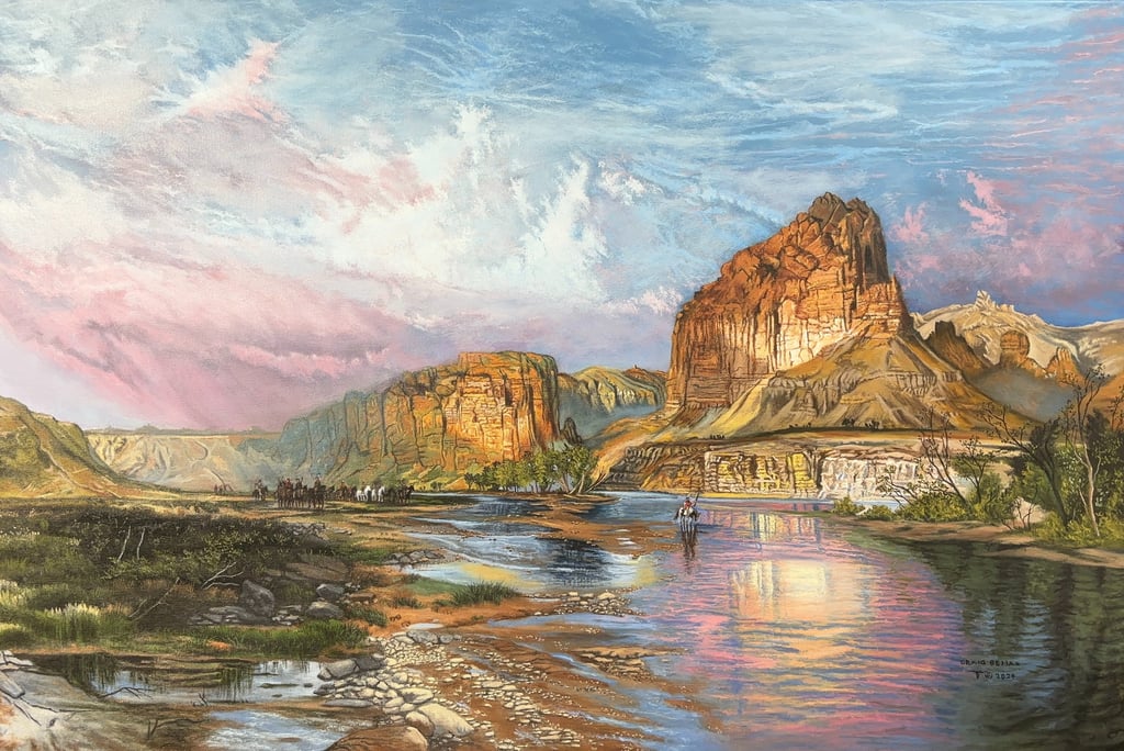 Beman considers himself to be a photo realist and enjoys the challenge of creating “a high-def image on canvas.” While the human eye cannot simultaneously focus on every aspect of a landscape, in a photo realistic painting, everything from the fence post in the foreground to the mountains in the background is crystal clear. Creating such a work requires a trained eye and a whole lot of patience. Beman’s lifelike paintings feature majestic Texas longhorns, exhilarating rodeo scenes, and exquisitely detailed saddles that look like they could be picked up and tossed over the back of a horse.